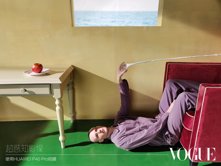 黎晓亮表示,稍瞬即逝的某些特定时刻 和突发的新鲜灵感在创作中都是可遇而不可求的。比如,模特开始只是静坐在我们制造的错置空间中,用倒置的海面来标示空间的不合理。但画面是美的,可他依然感觉空间的矛盾感还是不突出,于是想到让模特用杯子将水倒向真实的地面,让水流放大画面中“超现实”的部分,最终选用了质感更接近颜料的牛奶替代。这种抓拍需要快速的反应力,华为P40 Pro却在领先次就优秀的捕捉到了。
