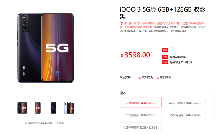 售价方面,iQOO 3 6GB+128GB版本售价3598元,目前在vivo官方商城购买,不仅可以获赠iQOO 原装入耳式耳机,还支持24期免息、赠100元组合配件券等,想要购买的朋友要赶紧行动起来啦!