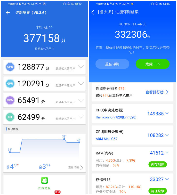 麒麟820在安兔兔上的综合性能得分为377158分,鲁大师的综合性能得分也超过了33万分。
