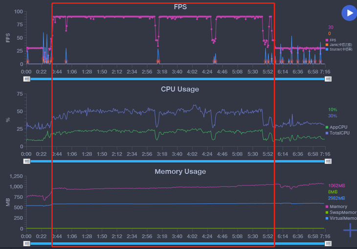 在游戏方面,就不得不再提一下手机90Hz的高刷新率屏幕,我们选择《王牌战士》进行体验,在90Hz的高刷新模式下,手机的流畅度有了很大的升级。通过记录的帧率来看,在红框中的游戏过程中,游戏能稳定的维持在90帧的水平,中途两个帧率下降是因为过场动画,游戏过程是非常流畅的。目前已经有多款游戏对90fps的帧率进行了适配,后续高帧率游戏也会越来越多。