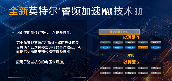 第十代智能英特尔酷睿S系列处理器运用了睿频加速MAX技术3.0,具有两个以这种模式运行的非常好的核心,从而提供更高的单核和双核睿频性能。简单来说,对于那种特别吃频率的游戏或者应用,睿频加速MAX技术3.0能够让CPU发挥出更强的性能。