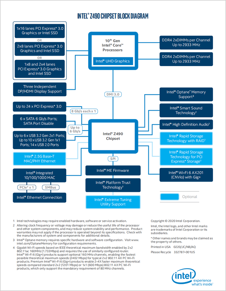 再来瞧瞧Z490平台的架构设计图。Z490芯片组主板支持24条PCIe 3.0通道,第十代智能英特尔酷睿S系列处理器支持16条PCIe 3.0通道,这样算下来Z490平台总计支持40条PCIe 3.0通道。