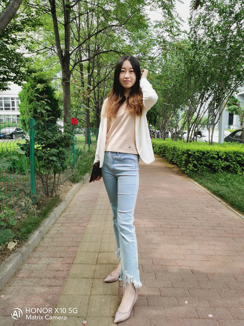 除了构图和擅用手机的人像模式外,其实在拍摄人像时还可以找一些特殊角度,比如将手机放低用低角度进行拍摄。荣耀X10的主摄折合35mm焦段为26mm,这已经算得上是一个比较广的广焦段了,在低角度拍摄时可以利用广角的优势让腿部显得更加修长。