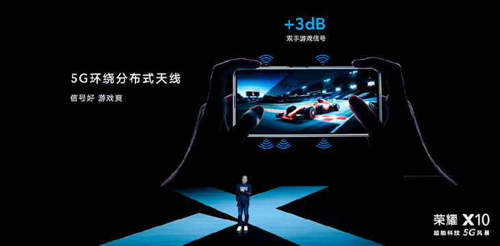 荣耀X10在横向握持玩游戏的使用场景也能够保证信号质量,从而带来更好的游戏体验。官方表示,在横握玩游戏的场景中,荣耀X10的信号相比上一代产品提升3dB,相当于信号增强了1倍。