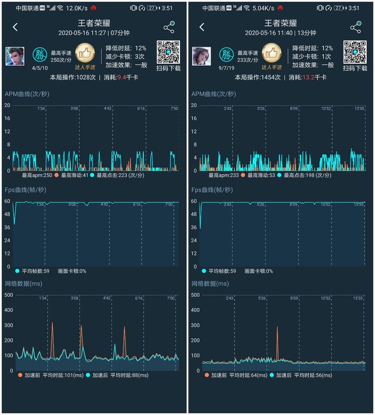 我们分别在4G网络和5G网络下进行了《王者荣耀》游戏测试。根据软件记录的结果,4G网络下《王者荣耀》的平均时延达到了101ms,游戏过程中网络的波动比较大,很多时候都保持在100ms以上的时延。而在5G网络下游戏平均时延为64ms,整体波动比较小,时延比4G网络要更低,操作响应更加迅速,对于竞技类游戏来说特别重要。