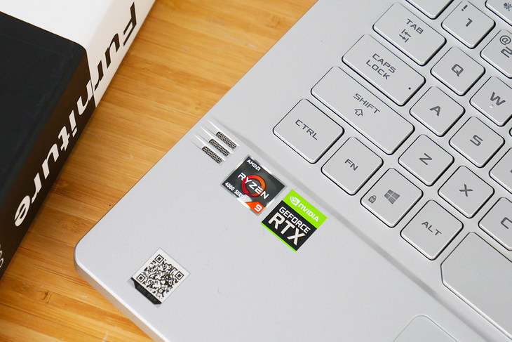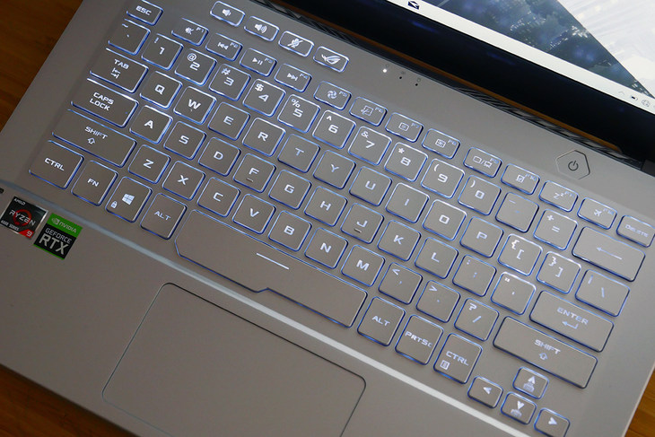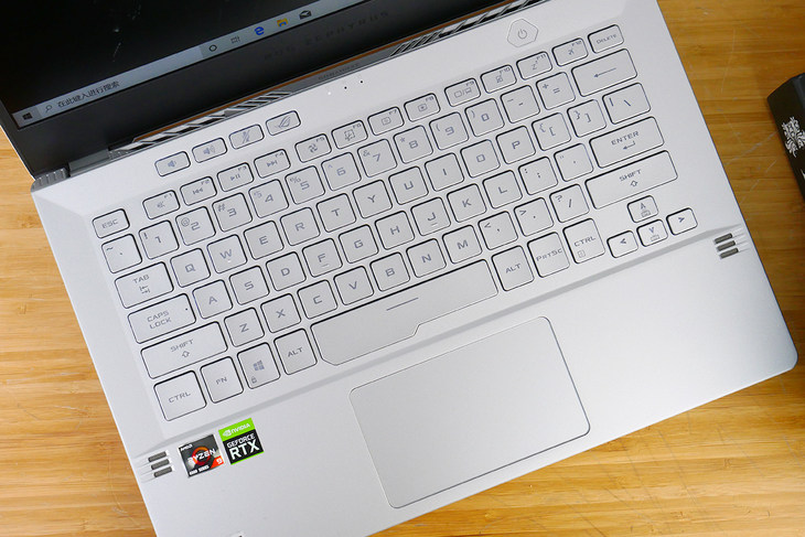 ROG 幻 14 配备了全尺寸巧克力键盘,键盘部分也采用了银白色的键帽,与整个 C 面浑然一体,配合白色的键盘背光灯,兼备颜值和实用性。