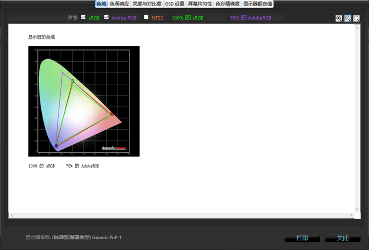 使用红蜘蛛校色仪进行测试,可以看到其拥有 100% 的 sRGB 色域, 78% 的 AdobeRGB 色域,表现很突出,无论办公还是游戏都有着相当出色的屏幕观感。