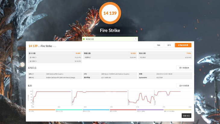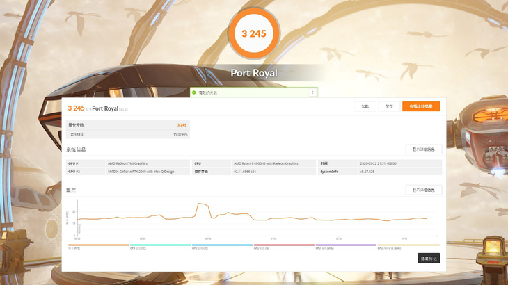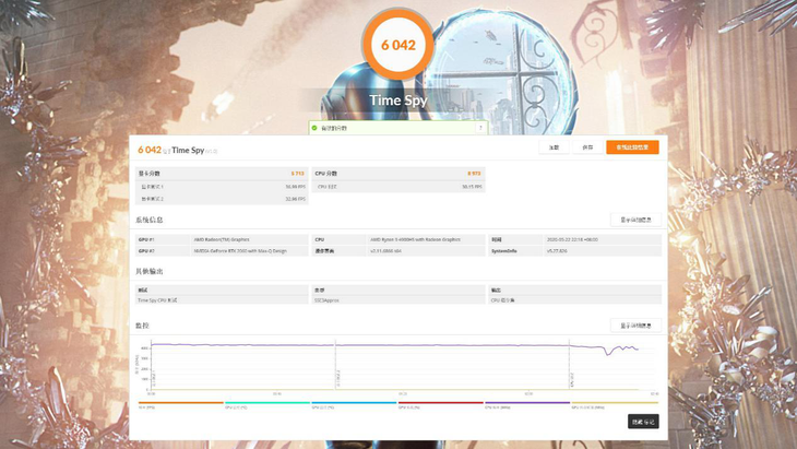 从 3DMark 系列的测试中能够看到,NVIDIA GeForce RTX 2060(Max-Q设计)的图形性能表现突出,在 RTX 独有的光线追踪以及 DLSS 性能上都属于主流水准,开关 DLSS 的测试成绩相差了 10fps,换算成百分比的话,打开 DLSS 后图形性能提升了 50%,由此可见 NVIDIA DLSS 技术的先进性。
