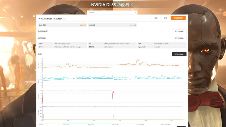 我们利用游戏自带的 Benchmark 做了一组 DLSS 的效能测试,两次测试的其他设置完全一样,开启和关闭 DLSS 的游戏平均帧数相差了 16.1,这样的效能差距还是相当巨大的。再次印证了 NVIDIA DLSS 技术的先进性和必要性。