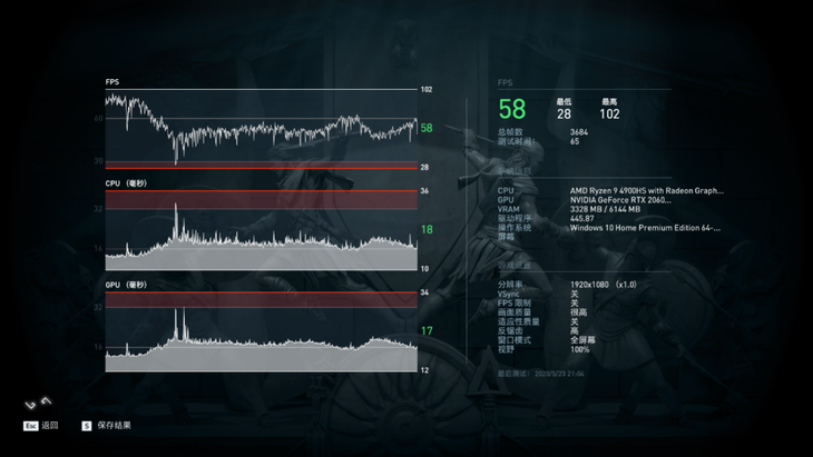另外我们还引入了四款非光追游戏的测试,来看看 ROG 幻 14 在游戏中的表现究竟如何。四款游戏均在 FHD 分辨率、高画质下进行测试,其中《刺客信条》和《战争机器5》的画面帧率在 60fps 左右,《全境封锁》平均帧数为 70fps,《极限竞速:地平线4》的帧数则达到了 96fps。