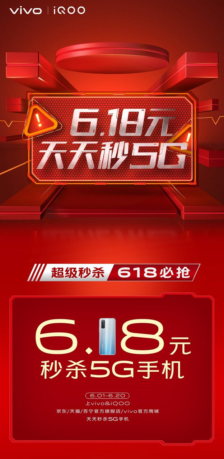 6月1日0时起,登陆vivo&iQOO京东、天猫、苏宁官方旗舰店及vivo官方商城,即可直达618开门红活动现场,畅享5G购机新机惠。