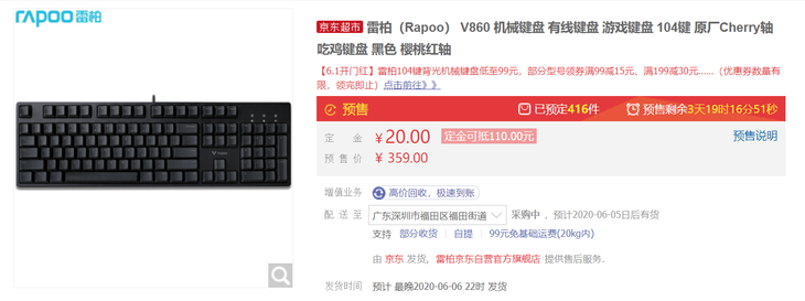 最近,雷柏V860机械键盘新品开启预售,这款新品官方售价399元,预售价359元,即日起到6月5日09:30,支付20元定金可以抵110元,也就是到手价只需269元。