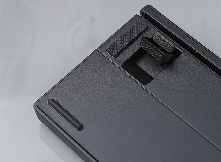 在一些小细节方面,雷柏V860机械键盘采用了三向导线槽,走线更加灵活。键盘底部还有大面积脚垫,能够起到很好的防滑作用,两段式的脚撑设计可以调节键盘高度,使用更加贴心。