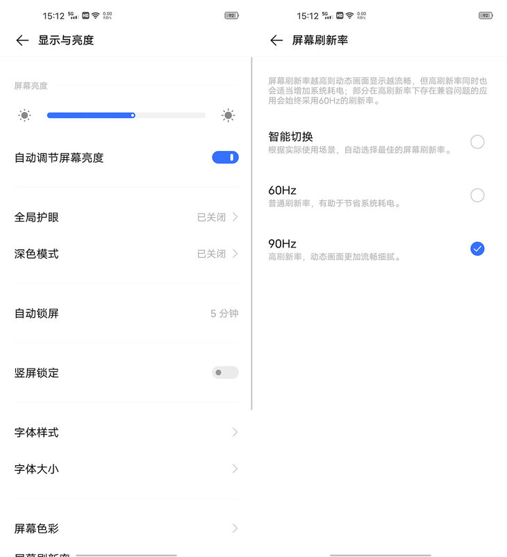 系统还提供了智能切换、60Hz、90Hz三种不同模式可选,智能切换模式系统会根据不同使用场景自动切换屏幕刷新率,能够兼顾续航和流畅度。如果你对视觉效果要求比较高,可以开启90Hz模式。