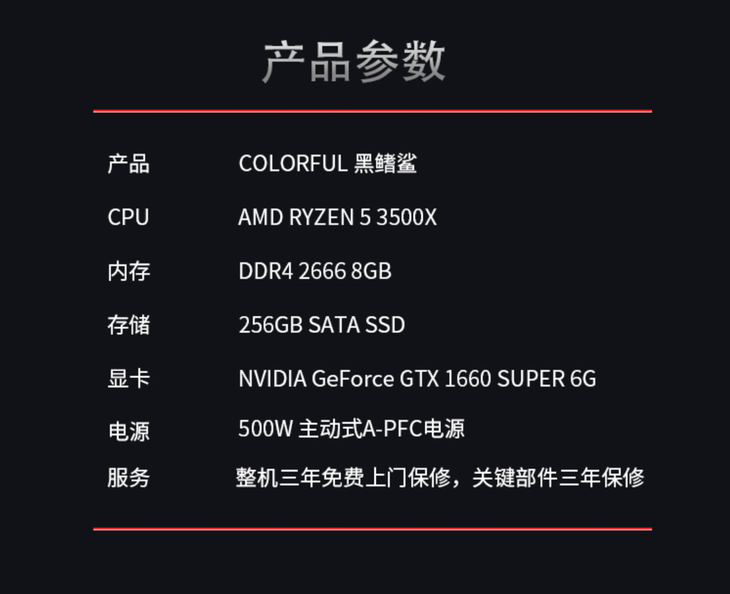 在核心配置方面,七彩虹黑鳍鲨游戏主机采用锐龙5 3500X处理器,为6核心6线程设计,高频率可达4.1GHz。另外还搭载了GTX 1660 SUPER 6G甜品级显卡,综合性能比GTX 1060有大幅提升。存储方面为8GB DDR4 2666内存、256GB SSD组合,除了可以带来更快的响应速度,综合性能也可以轻松应对主流的网络游戏。