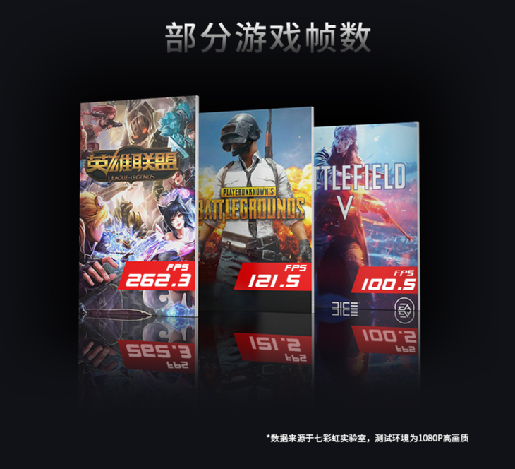 根据官方公布的信息,1080P高画质下,玩《英雄联盟》可达262.3帧,《绝地求生》可达121.5帧,《战地5》可达100.5帧,能够获得非常出色的游戏体验。