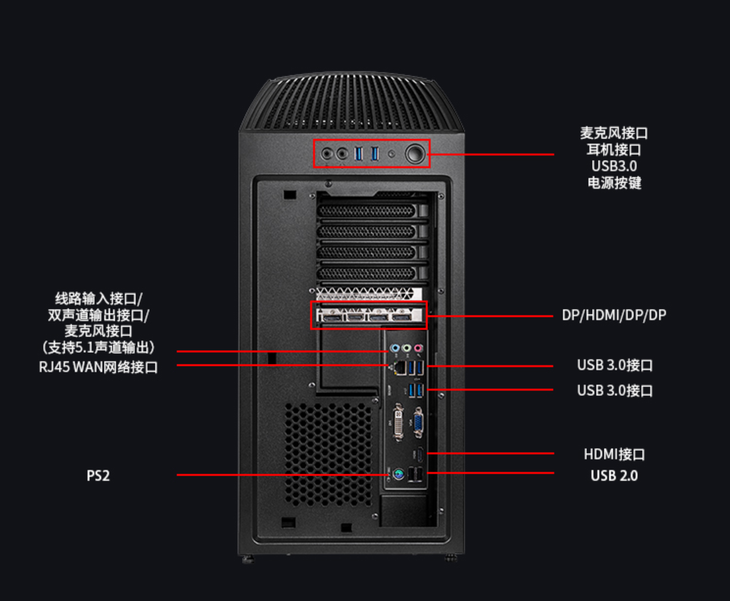 前面板红色呼吸腮不仅能够强化电竞氛围,同时还是机箱进风口,可以保证机箱内部风道的畅通,提升散热效率。七彩虹黑鳍鲨游戏主机还把传统的后置接线方式改为上置,加上可拆卸上盖隐藏线材,线材更加整齐有条理。