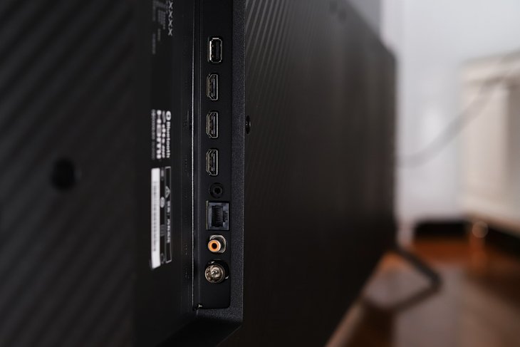 智慧屏的电源接口和其它接口分别位于机身两侧,这样不会过于拥挤。常用接口区域,包括3个HDMI接口、1个USB3.0接口、同轴音频输出接口、以太网口等接口,可以轻松满足用户的日常使用需求。