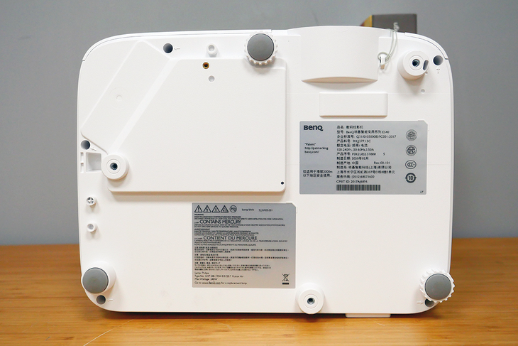 明基E540底部有两个可以调节高度的脚垫,通过调节高度可以调整投影画面的角度。