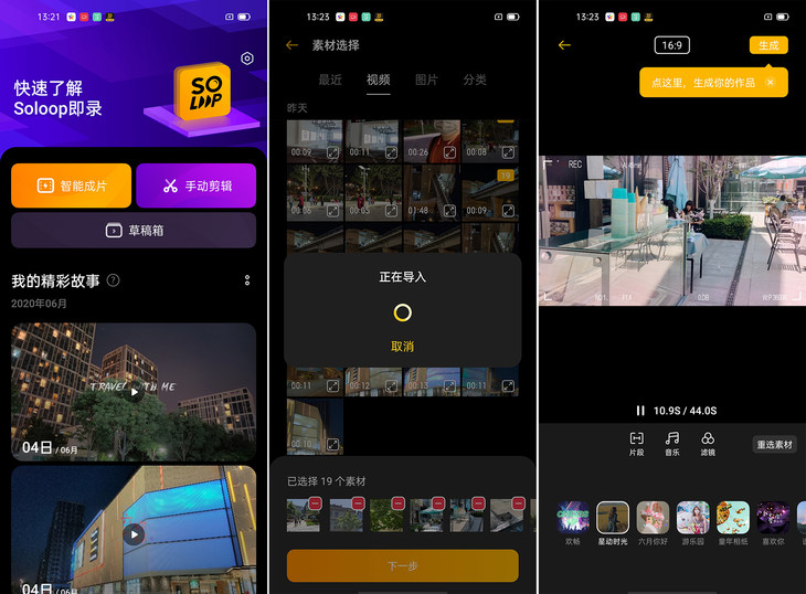 Soloop即录APP,选取素材和模版后可自动生产有情景、场景转换的短片