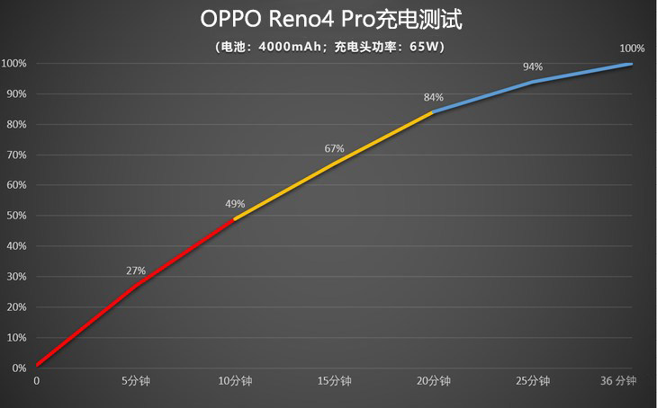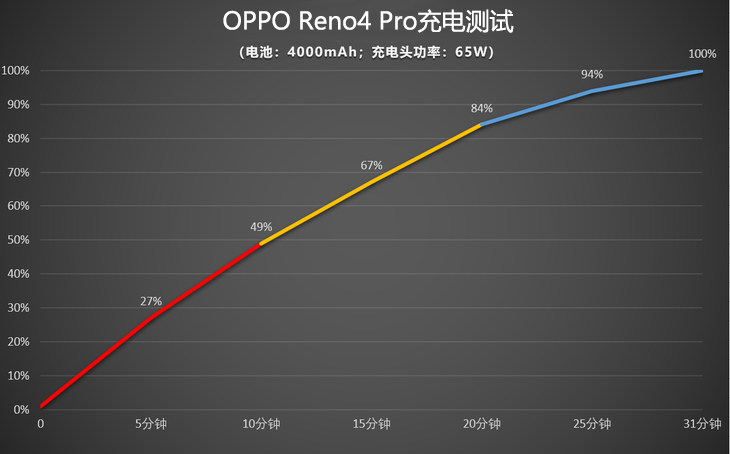 充电方面,OPPO Reno4 Pro也有着非常大的惊喜,支持65W的SuperVOOC 2.0超级闪充,在充电速度上优异算的是领先梯队。虽然机身厚度仅为7.6mm重量也保持在172g轻量级水平,但是内部却为一块4000mAh的电池,在65W闪充的支持下相比上代OPPO Reno3 Pro的30W闪充,充满电的时间缩短一半,而且15分钟就可以快速充电60%以上,从实际测试的数据来看,仅用了30多分钟就能将手机从0电量充到满电。
