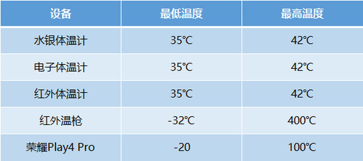 荣耀Play4 Pro的测温范围是-20℃~100℃,应用场景会更加广泛。