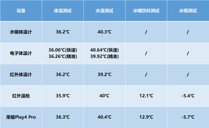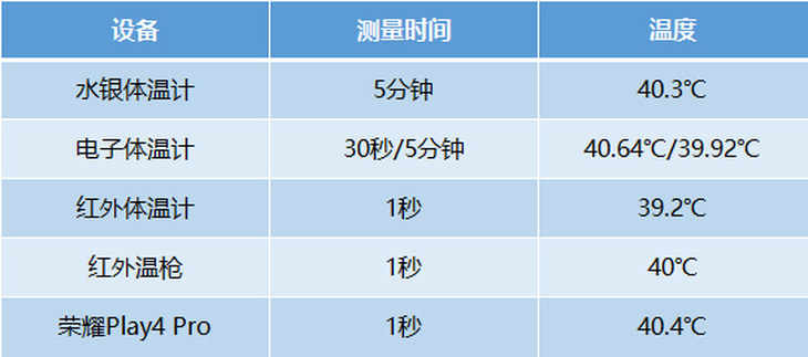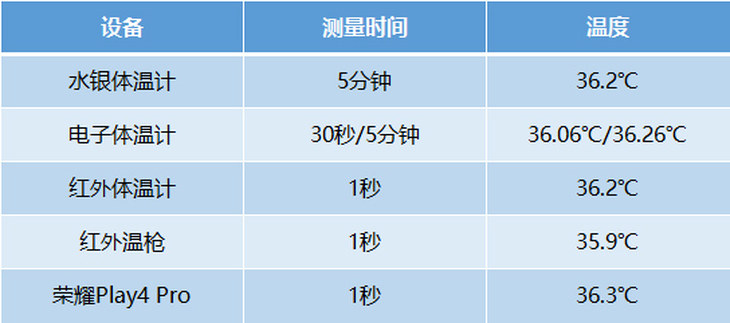 从结果中可以看到,不同的温度计测试的结果误差都不大,不到1℃。经过两次测试可以看出,在体温范围内,荣耀Play4 Pro具备了较为出色的温度测试能力,精准度也能够得到保障。