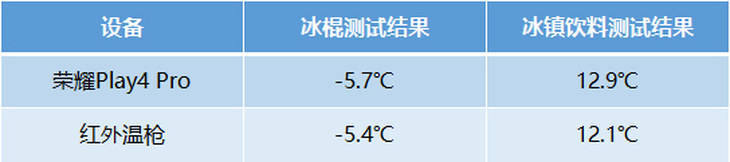 那么在低温情况下,荣耀Play4 Pro的测试结果又会如何呢?因此我们再次进行了低温测试。包括冰棍以及冰镇饮料的温度测试。因为水银体温计、电子体温计以及非接触式电子体温计不支持这一范围的温度,因此参与测试的只有红外温枪和荣耀Play4 Pro。