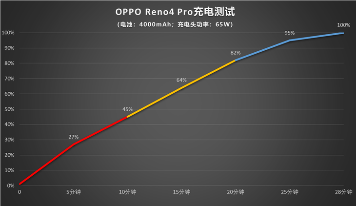 充电方面,在手机剩余电量为1%的时候,使用原装充电器进行充电测试。在实际测试中,只需5分钟即可达到27%的电量,10分钟即可达到45%的电量,达到100%的电量只需28分钟。从上面的折线图可以看到,Reno4 Pro充电全程都能保证比较高的效率,即使在最后的95%到100%的电量区间仍旧能保持不错的充电速度。