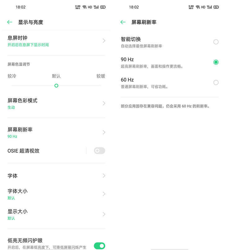 Reno4 Pro电量为100%的时候开始续航测试,屏幕亮度为50%,WiFi网络下。屏幕刷新率为智能切换模式,这种模式下系统会根据不同使用场景,自动切换不同刷新率,兼顾视觉流畅度和续航表现。当然你也可以选择90Hz模式或者60Hz模式,在流畅和续航上,可以根据自己的喜好选择。