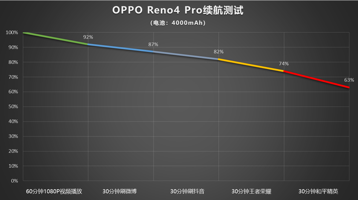 Reno4 Pro在充电方面给我们带来了非常大的惊喜,续航上又有什么样的表现?我们进行了长达3个小时的重度使用测试,包括在线看视频、玩游戏、刷微博等日常使用场景,通过模拟日常使用场景测试续航表现。