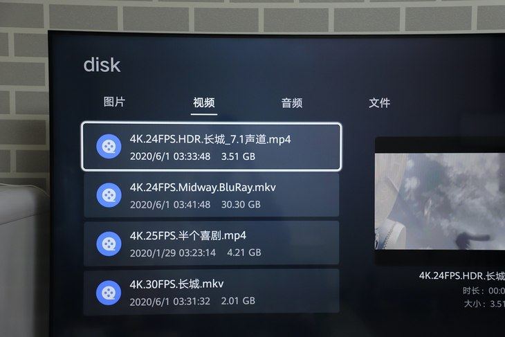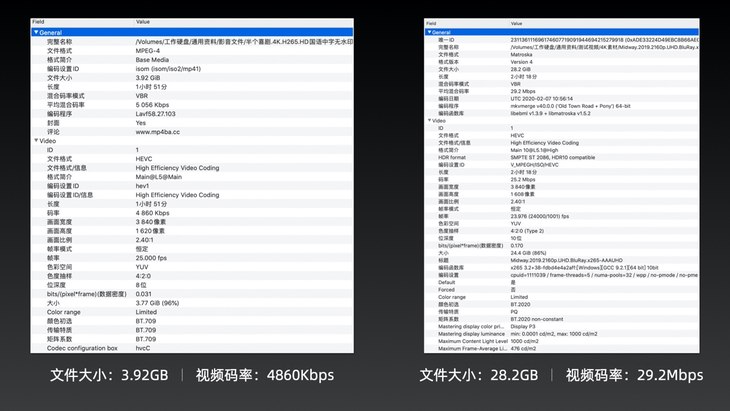 由于大屏产品面向家庭为主,很多普通消费者并非专业发烧友,这里简单补充一点小知识。为何网上都号称是4K蓝光电影,但文件大小相差数十倍。其实大家都是4K分辨率,电影的帧率一般也在30FPS以内,但核心区别是码率、色深。就像上图是测试中的两部4K影片的信息,视频码率直接决定文件大小。简单说文件越大、码率越大,画质就越好。