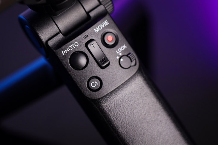 索尼GP-VPT2BT蓝牙手持手柄一共5个可操控的按键,其中包括了中间的电动变焦拨杆、左右上角的照片快门与视频拍摄按键;左下角则为一个自定义功能键,可以直接在手柄上快速调出一项参数方便调节(与相机C1自定义键功能相同),右下方则是一个锁定拨杆,在选择lock功能后所有按键都为无效状态,防止误操作。与索尼ZV-1搭配起来更加适合vlog以及进行美妆、美食等视频的拍摄。