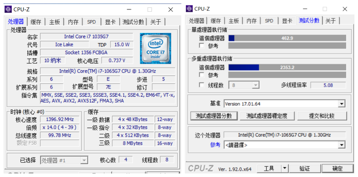 在CPU-Z测试中,多任务处理得分2353.2,单任务处理得分462.9,能够满足日常的办公、影音娱乐,以及PS等图形图像软件的应用。