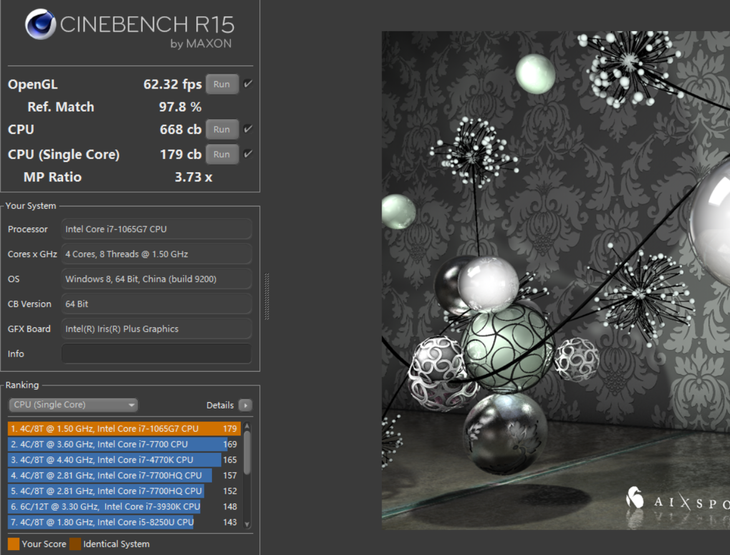 通过Cinebench R15测试,华硕灵耀14的单核成绩为179cb,多核成绩为668cb。