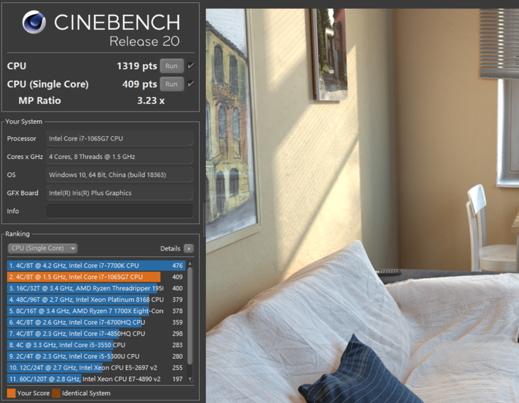 Cinebench R20测试,单核成绩为545pxs,多核成绩为1759pxs。