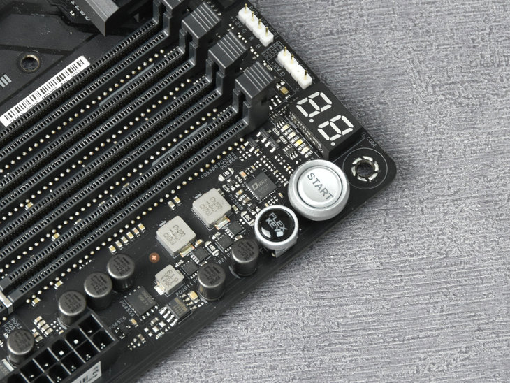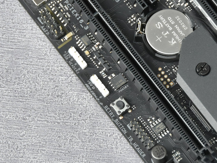 PCB左侧边缘设计了RETRY按键,用于玩家超频失败后重启电脑使用。RETRY按键傍边设计有AURA SYNC灯效接针。