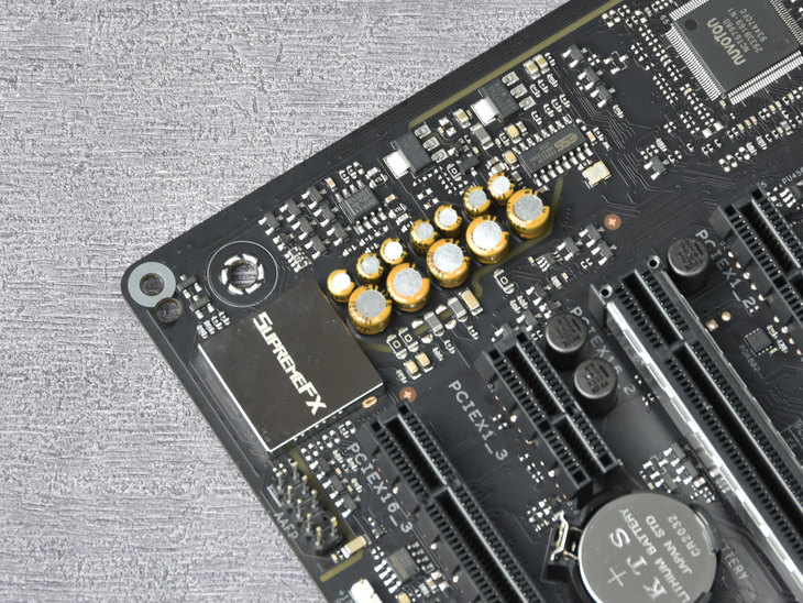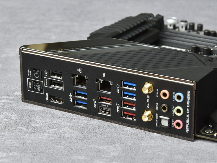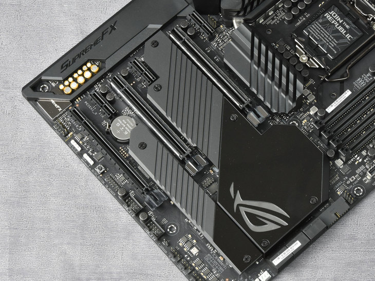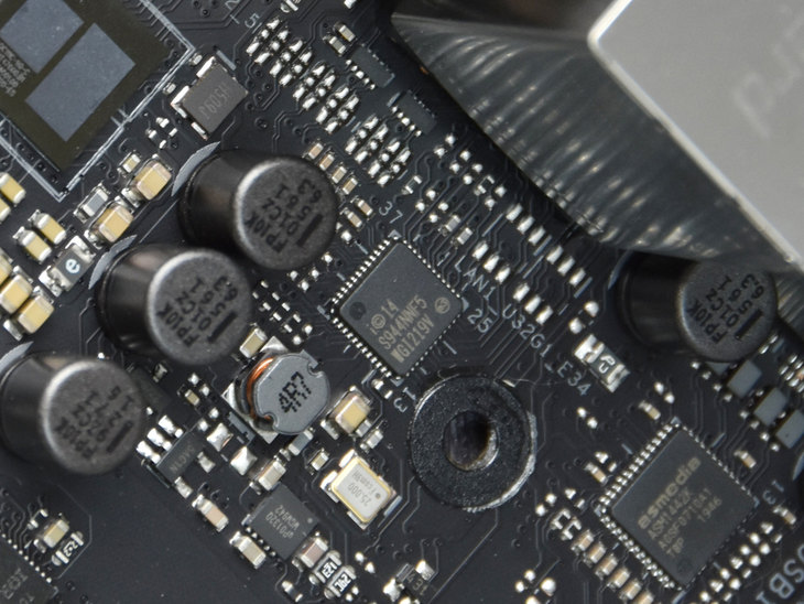 ROG旗舰级的SupremeFX S1220音频芯片。借助一系列专业音频设计,官方标称其能够提供120 dB立体声播放输出和113 dB SNR录制输入,音频性能足以媲美很多独立声卡。