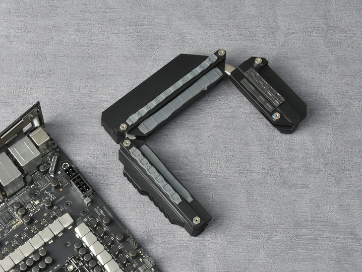 这块一体化散热片内置有一根很粗的导热管,将三块散热片贯穿了起来。