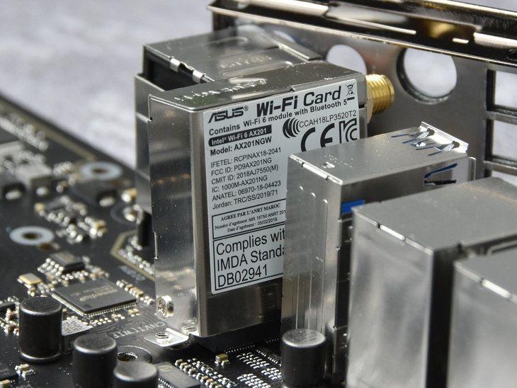 这款主板还板载了Intel WiFi 6 AX201 (802.11 ax)无线网卡,并且在I/O背板出设计了Wi-Fi 6天线模块接口。Wi-Fi