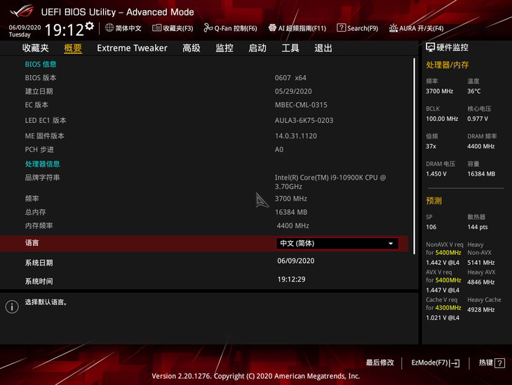 开机按DEL键,可以进入华硕ROG MAXIMUS XII HERO (WI-FI)主板的BIOS。BIOS界面支持简体中文显示,鼠标或者键盘均可操控,简单易用。