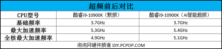 关于酷睿i9-10900K处理器加载AI智能超频的结果,笔者列出了一张频率对比表格。(利用HWiNFO这款软件,能够一目了然地识别出AI智能超频后的处理器频率状态。)