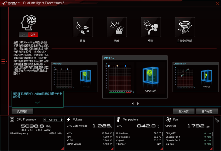 在AI Suite 3这款软件的Fan Xpert 4界面下,点击风扇调校,即可开启AI智能散热。此时AI智能散热会自动调校系统内的所有风扇转速,进而实现散热性能与静音之间的平衡,为用户带来安静舒适的电脑使用体验。