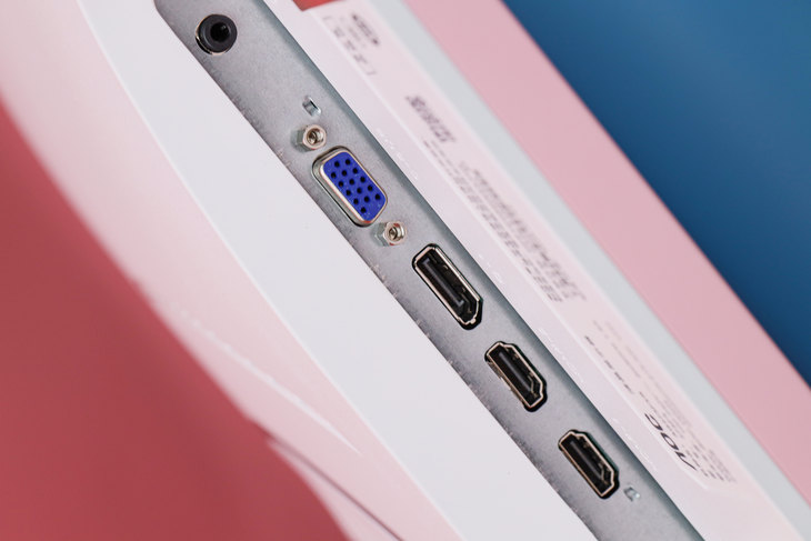 这款显示器还配备了两个HDMI接口、一个DP接口、一个VGA接口、一个音频输出接口(用于连接耳机或者音箱)。