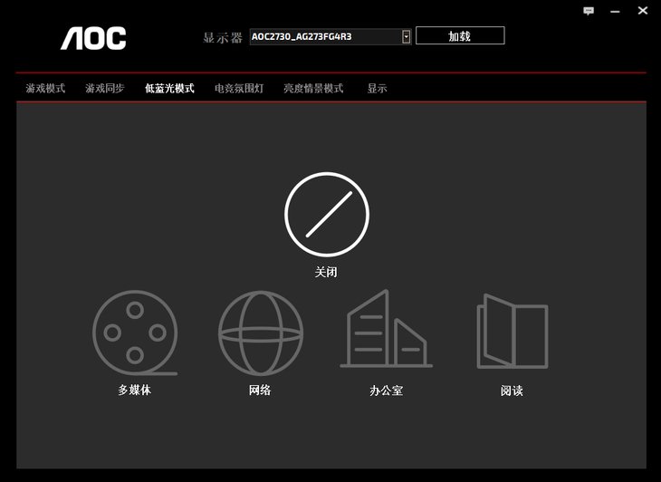 “低蓝光模式”界面下提供了“多媒体”、“网络”、“办公室”、“阅读”这四种低蓝光模式。对于天天需要长时间坐在电脑前面的用户们来说,“低蓝光模式”设置无疑是相当实用的,可以保护视力,抵抗用眼疲劳。