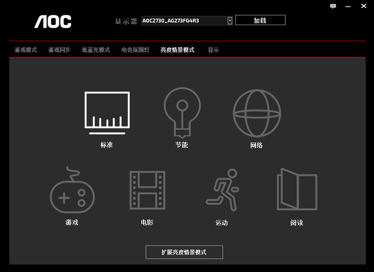 在“亮度情景模式”界面下,提供有“标准”、“节能”、“网络”、“游戏”、“电影”、“运动”、“阅读”这七种亮度情景模式。
