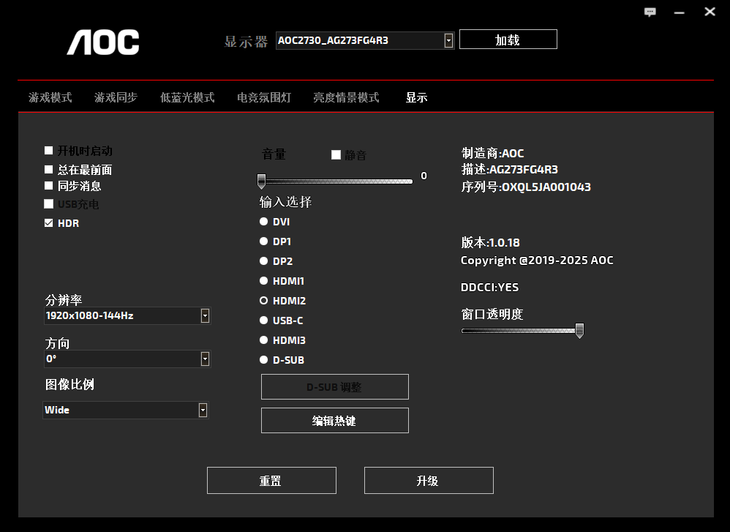 在“显示”界面下,玩家可以进行分辨率调节、信号输入源切换等操作。