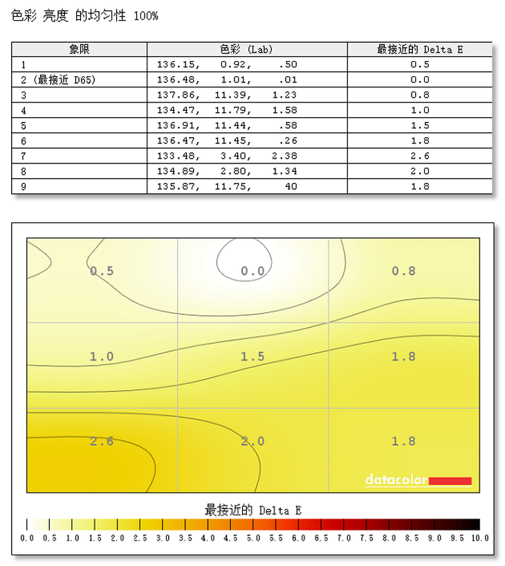 测试小结:在D65标准中,色温值为6500K表示色彩比较准确,不会出现偏冷或者偏暖。通过测试可知,这款显示器中央正上方区域(2号测试区域)最接近D65的标准。屏幕左下角区域(7号测试区域)偏差最大,差值为2.6。