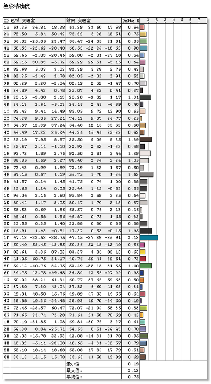 测试小结:平均△E为0.75,△E≥3的颜色完全没有。这样的色彩精准度无疑也是非常出色的。