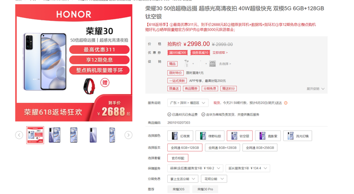 荣耀30 6GB+128GB版本目前在华为商城售价2998元,高可减310元,到手价低只需2688元,还有耳机、数据线等赠品,想要购买的朋友赶紧行动起来吧。